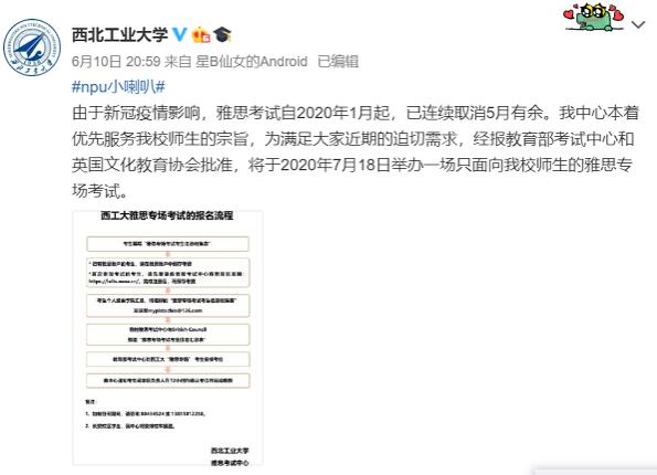 目前,雅思考试能否顺利在7月复考已经成为众多考生关心的焦点,川外小编也实时关注着。而就在前几日晚间,一个好消息传来,西北工业大学通过微博正式宣布:将在7月18日举办一场