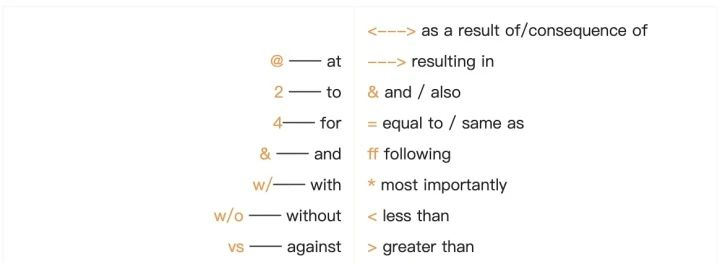 速记能力再快,对于听来说,都是比较慢的。所以在记笔记的过程中,除了速记,还要学会使用缩写和符号,构建信息与信息之间的关系,比如说比较、对比、因果等关系。选择性地用一些符号来取代又长又臭的逻辑词,不仅会让我们的手速加倍,在回顾笔记时也思路更清晰。比如:因果关系,我们可以用箭头来表示;上升用↑;下降用↓等等。这里给一个符号的示例,可以参考,也可以自己发展一套符号笔记系统。
