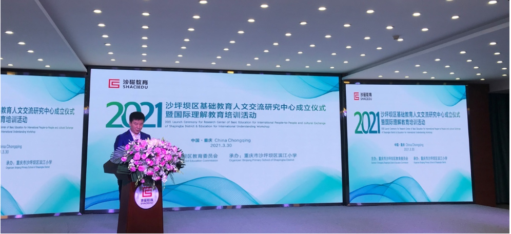 3月30日,四川外国语大学培训中心受邀参加了由沙坪坝区教委主办、滨江小学承办的沙坪坝区基础教育人文交流研究中心成立仪式暨国际理解教育培训活动。本次活动是教育部中外人文交流中心与沙坪坝区共建中外人文交流教育试验区的重要成果,教育部中外人文交流中心主任杜柯伟、机制工作二处处长陈滔伟、项目主管杨瑒,重庆市教委一级巡视员邓睿、国际处处长李斌,沙坪坝区人民政府副区长周红玲等领导出席仪式。沙坪坝区委教育工委书记、教委主任向斌主持仪式。