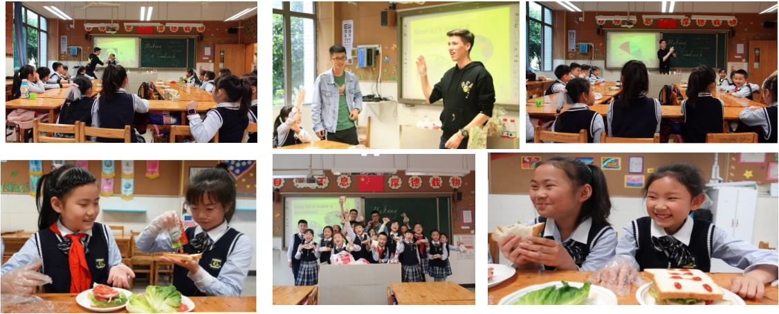 本着沉侵式、寓教于乐的理念,在英语文化交流课堂上,陈诚老师巧妙地以三明治制作为主题,除全面介绍三明治所需食材,餐具等相关词汇外,还给学生们重点讲解了中西餐饮文化的区别。与此同时,课堂中还穿插许多互动有趣的游戏环节,比如通过“大转盘”、“我是小小品尝家”之类的小游戏来复习回顾学过的单词,课堂氛围轻松有趣,学生们都兴致高昂。课堂第二部分,在外教老师的示范和带领下,同学们分成小组自行制作三明治,不仅学会了很多相关英语词汇和表达,还极大提升了自己的动手能力和实践能力。